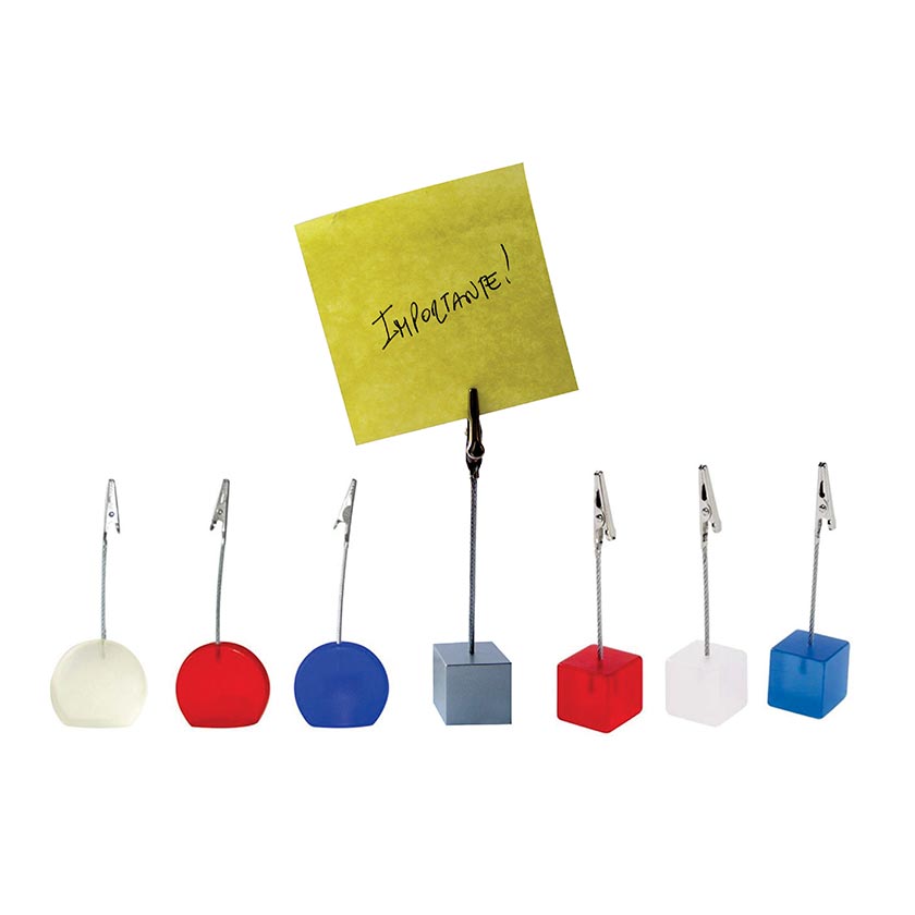 Contamos con modelos en media luna y cubo, fabricado en acrílico con tensador de metal inoxidable de larga duración, impresión en serigrafía (en el caso del memo clip en cubo) o impresión en tampografía (en caso del memo clip en media luna).